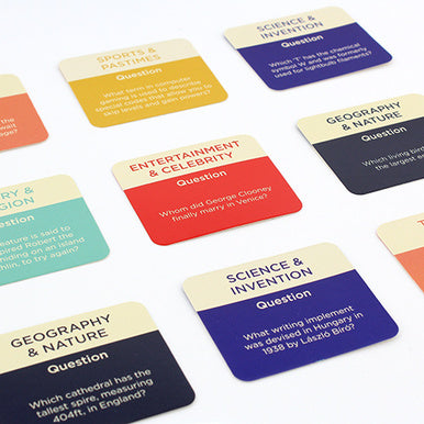 Including six trivia categories, this set of three hundred question and answer cards ensures hours of intriguing after-dinner fun! Flabbergast your friends and family with your geographical genius, your musical mastery of your historical know-how!