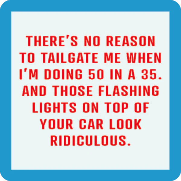 “There’s no reason to tailgate me when I’m doing so in a 35. And those flashing lights on top of your car look ridiculous.”