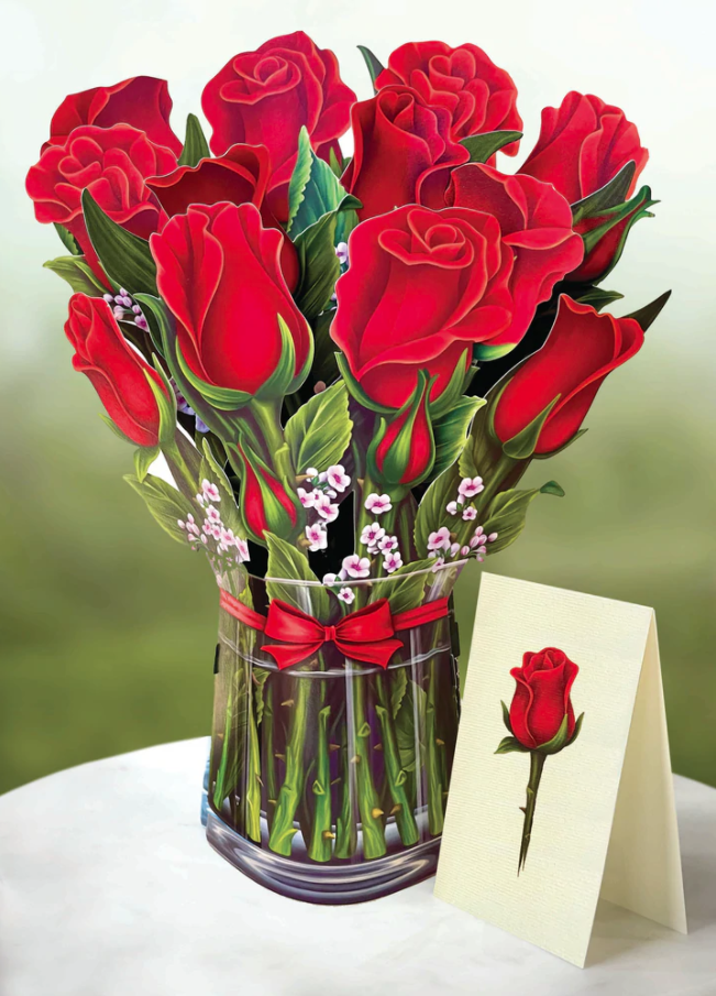 This classic FreshCut Paper pop up bouquet boasts a full dozen luscious Red Roses, with a sprinkling of Baby’s Breath.
