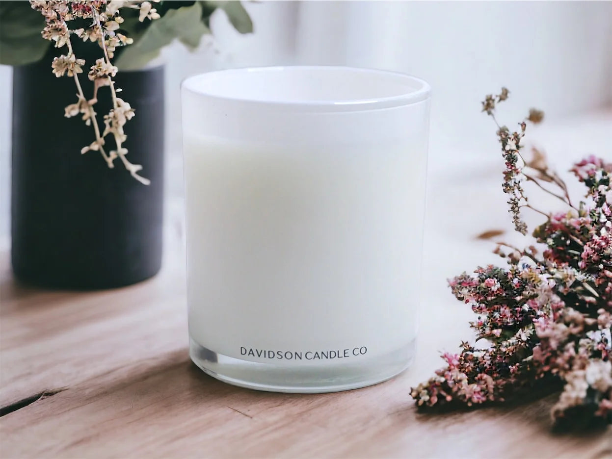 This heavy glass container is substantial in weight, white in color with a glossy finish. Our glass candles measure approximately 3.75 tall and 3.25 and holds 11 oz of wax.