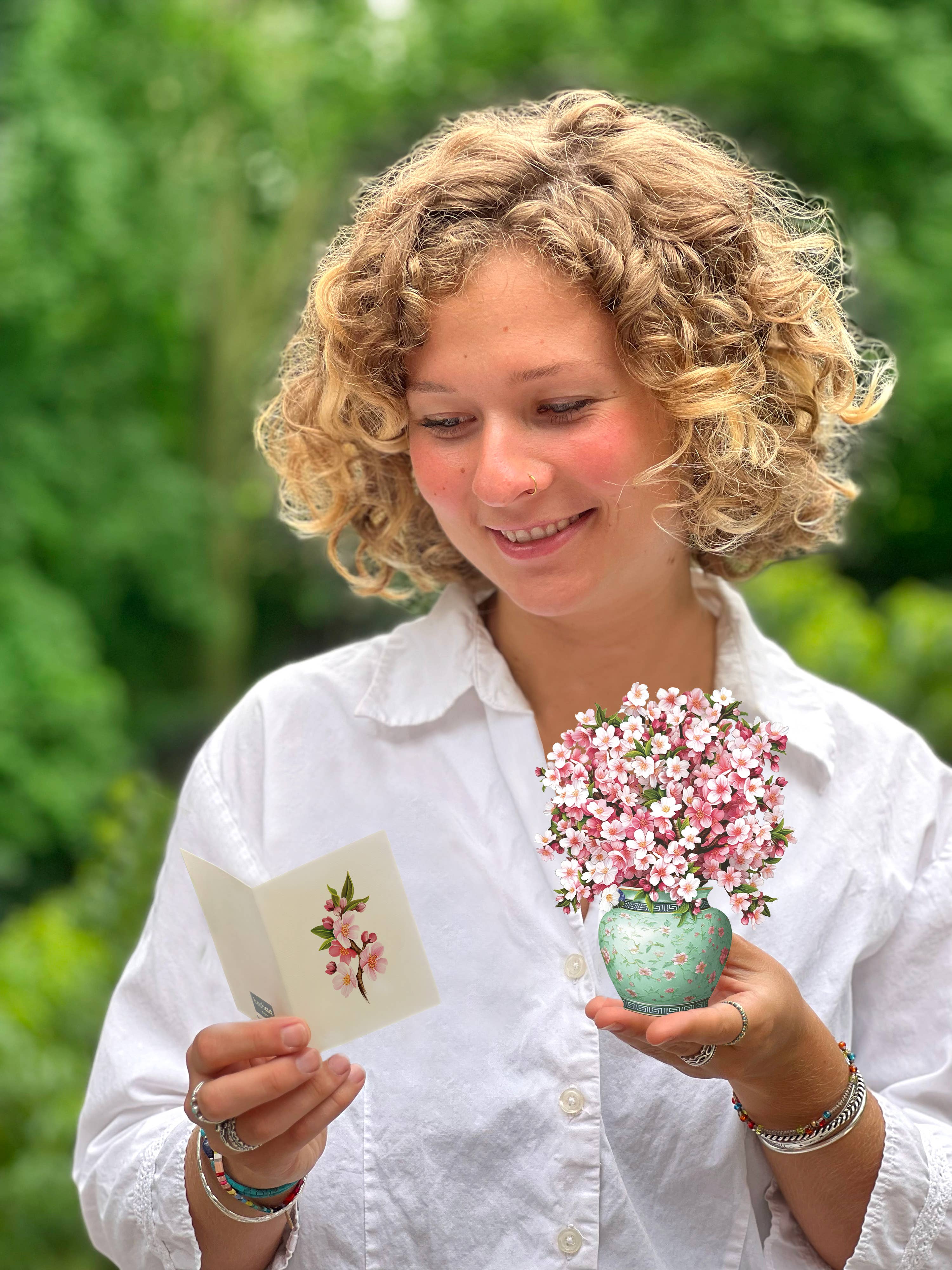 Each pop up flower card includes a small blank coordinating notecard. With soft pink petals symbolizing renewal, the Mini Japanese Cherry Blossom Bouquet is a beautiful gesture of love and care. This elegant pop-up blooms year-round in an ornate jade-inspired vase, making the Sakura's feeling beauty a forever accent in offices, dorm rooms, on mantles, and bedside tables.