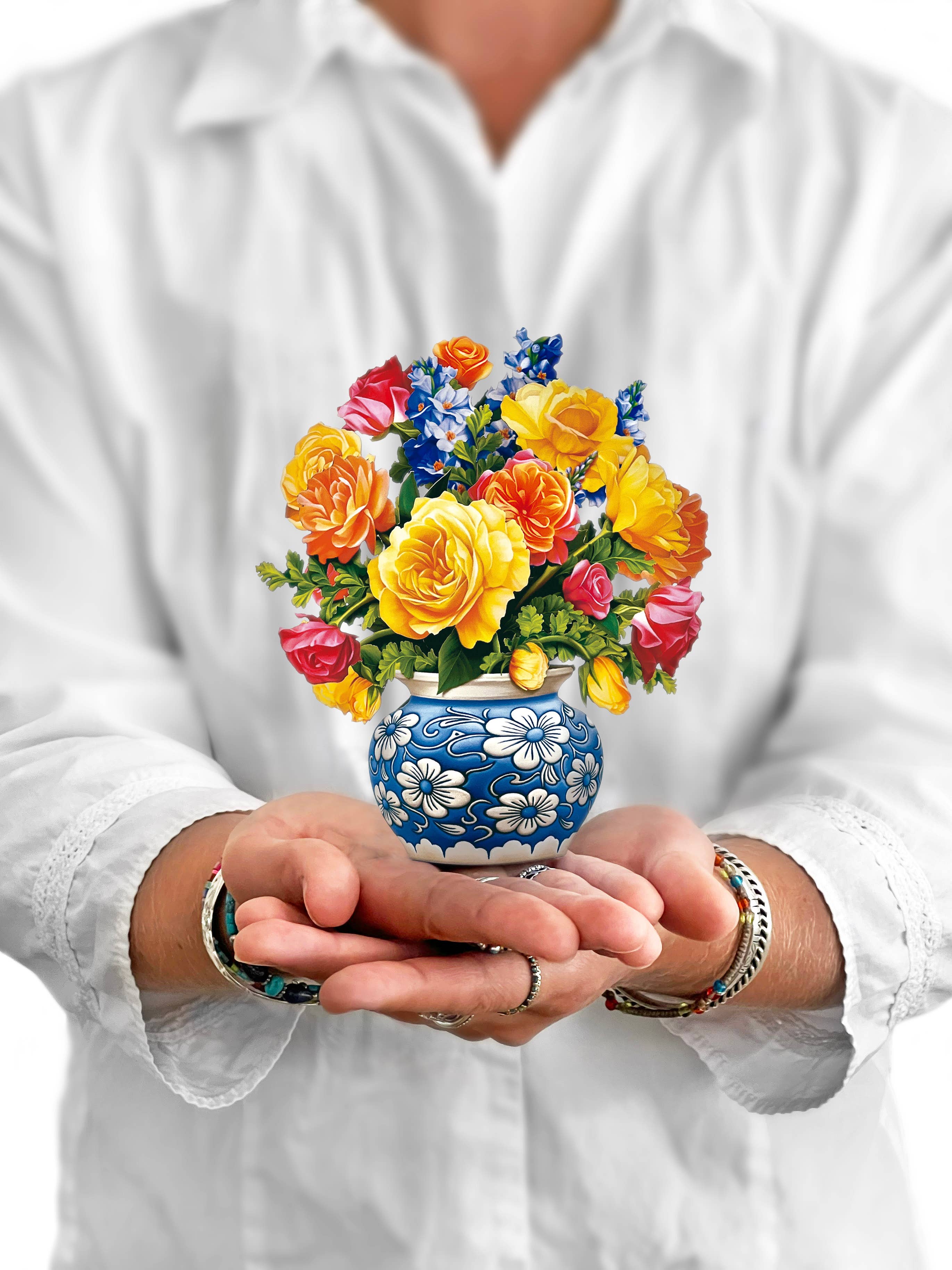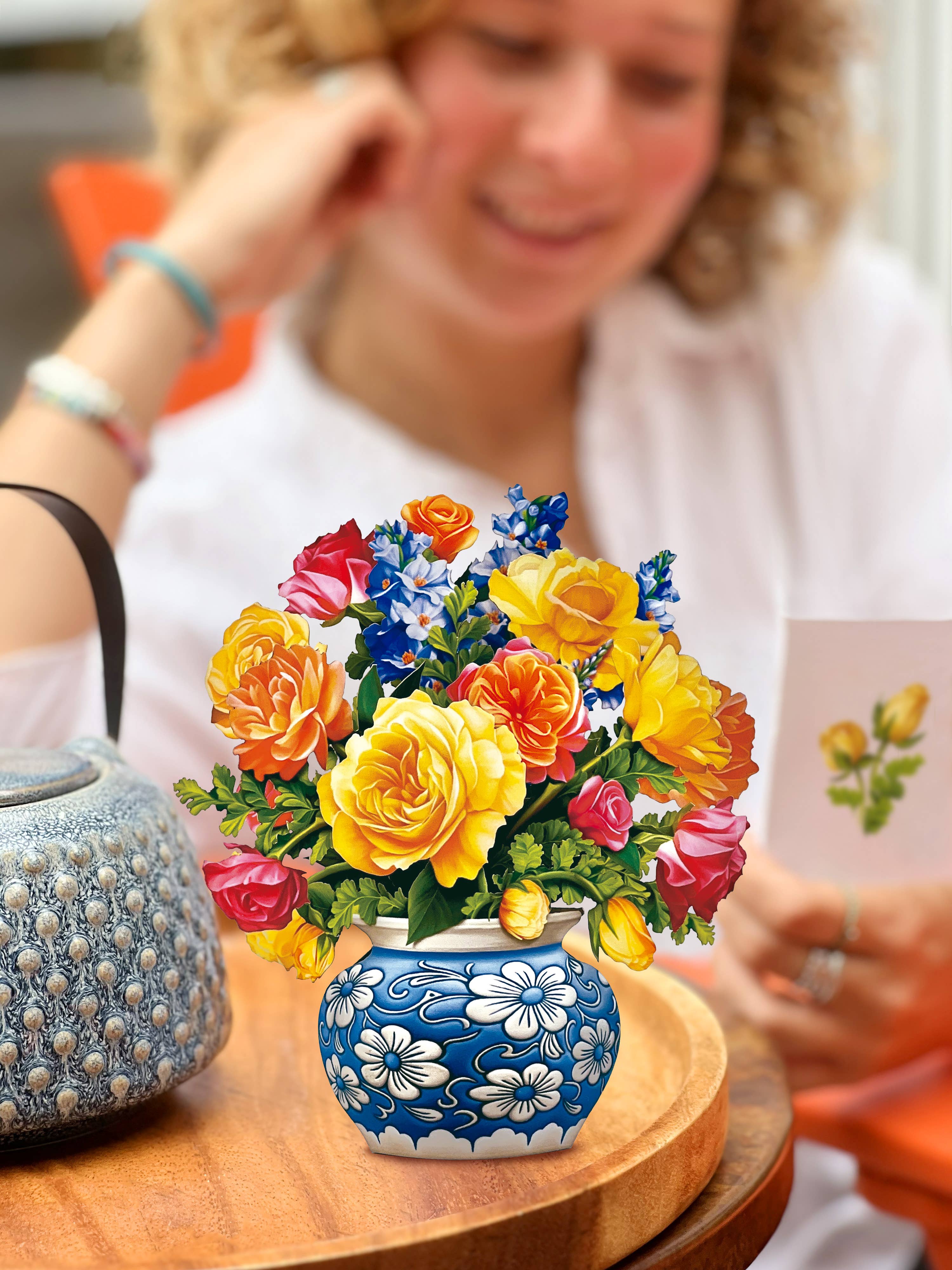 Each pop up flower card includes a small blank coordinating notecard. A bright and refreshing pick-me-up in a perfectly petite size. Decadent shades of raspberry red, tangerine, strawberry pink, and limoncello burst from an array of roses, alongside snapdragon accents in a fitting floral-print ceramic vase.