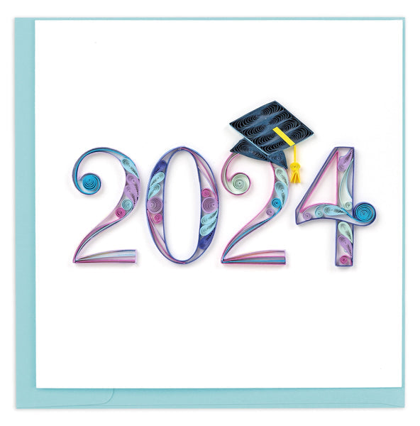 Celebrate a 2024 graduation with this handmade year card. The quilled 2024 and graduate cap is sure to be a forever keepsake. The blue and purple hues of this card are accentuated with the golden tassel.