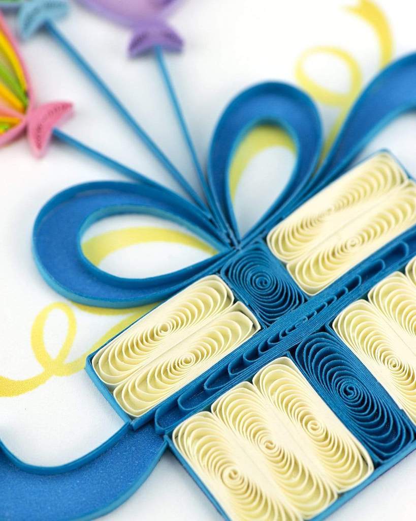 Send a Quilled Birthday Card to a friend or loved one from ages 8 to 80! This paper art design is timeless and playful for any upcoming birthday celebration. The artwork features three rainbow colored balloons with intricate and unique patterns tied to the blue bow of a cream colored present.