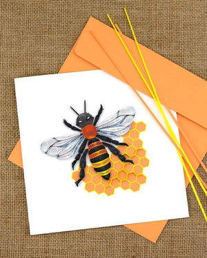Share this mighty quilled worker bee with your friends and family all year round. Honey Bees are an essential part of our planet's survival and a unique insect for a greeting card. The handcrafted design features an orange, yellow and black honey bee with its wings spread as it rests on a yellow and orange honeycomb.
