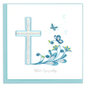 The Quilled Sympathy Cross Card is an elegant greeting card that you can give to a friend or loved one going through a loss. This card contains a simple, yet elegant blue and white quilled cross with blue and white quilled flowers on the right side of the cross and a few butterflies. Underneath the card it reads, with sympathy.