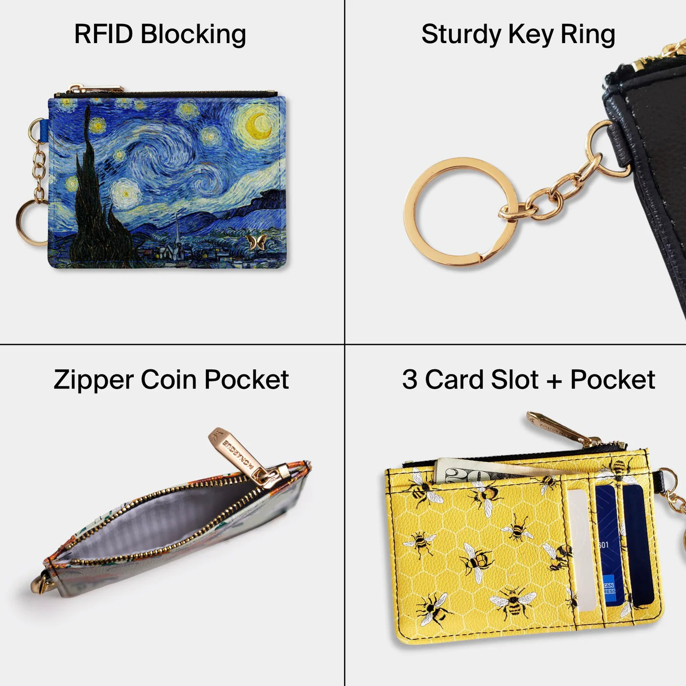 Monarque’s Keychain Wallet not only offers function but offers beauty. Our nature and art inspired wallet is textured vegan leather featuring three card slots, an additional pocket for larger paper items and a zippered center pocket. The gold toned chain and keyring provides easy access for keys. The RFID blocking technology will protect against identity theft.