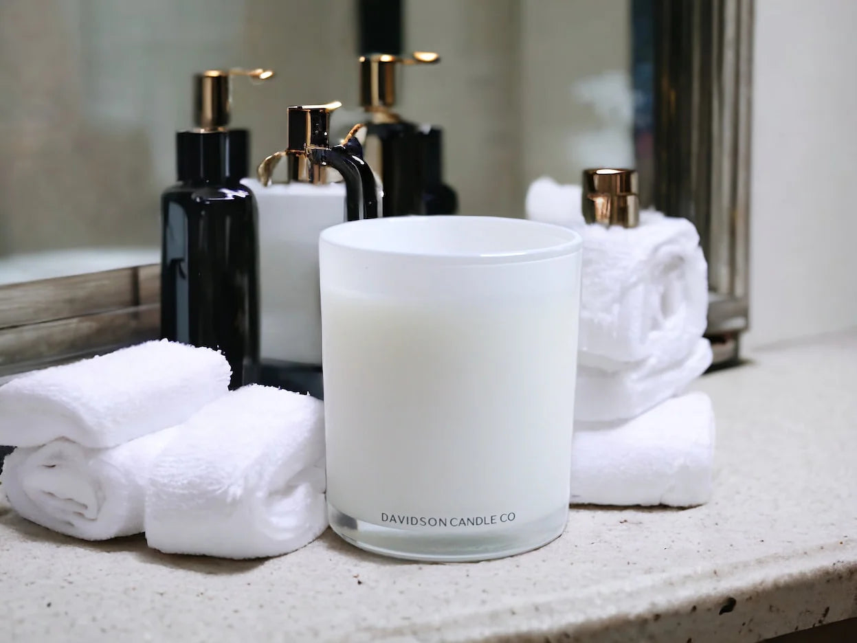 This heavy glass container is substantial in weight, white in color with a glossy finish. Our glass candles measure approximately 3.75 tall and 3.25 and holds 11 oz of wax.